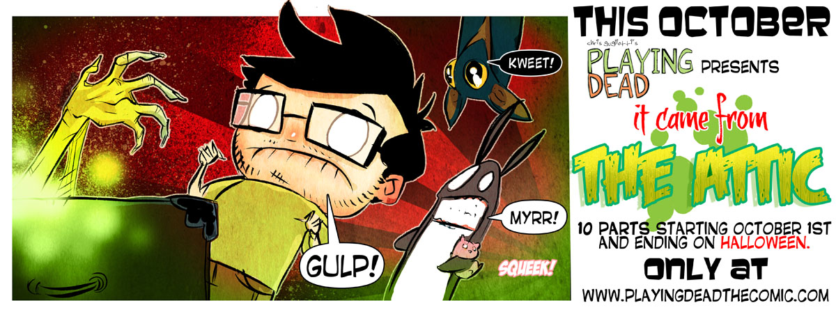 Biggish announcement. This is what I’ve been working on while my ginger buddy Jason Snair has be guest artisting all over my baby. I did a halloween adventure last year but this year…This thing managed to turn into 10 full comic book sized pages. It starts Oct 1st and ends on Oct 31. Do visit, bring friends, get scared, and maybe you’ll see nibbles dressed as Tim Curry from the Rocky Horror picture show. Maybe.