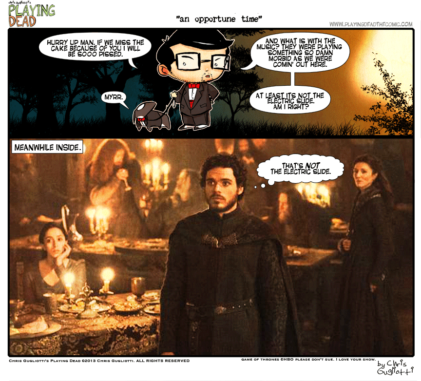 An Opportune Time by cgugliotti on November 12, 2013 at 8:30 am Chapter: comics In which it’s not such a nice day for an unwhite wedding. └ Tags: Animated, chris gugliotti, comic, comic strip, dachshund, dog, fantasy, friendship, game of thrones, george rr martin, life, man's best friend, nibbles, playing dead, red wedding, rob stark, the red wedding, web comic, Web comics, webcomic