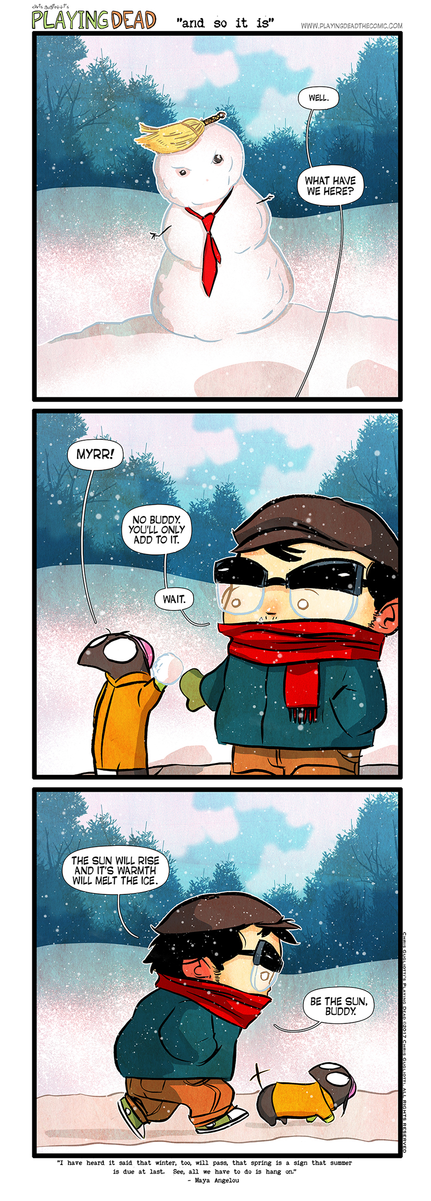 And So It Is by cgugliotti on January 24, 2017 at 9:00 am Chapter: comicsCharacters: chris, nibbles In which we be the sun └ Tags: anxiety, autobiographical, be good, chris gugliotti, comic, comic strip, dachshund, dog, donald trump, friendship, introspection, life, man's best friend, man-child, maya angelo, nibbles the dachshund, playing dead, snow, snowman, warmth, web comic, Web comics, webcomics, winter, wtf