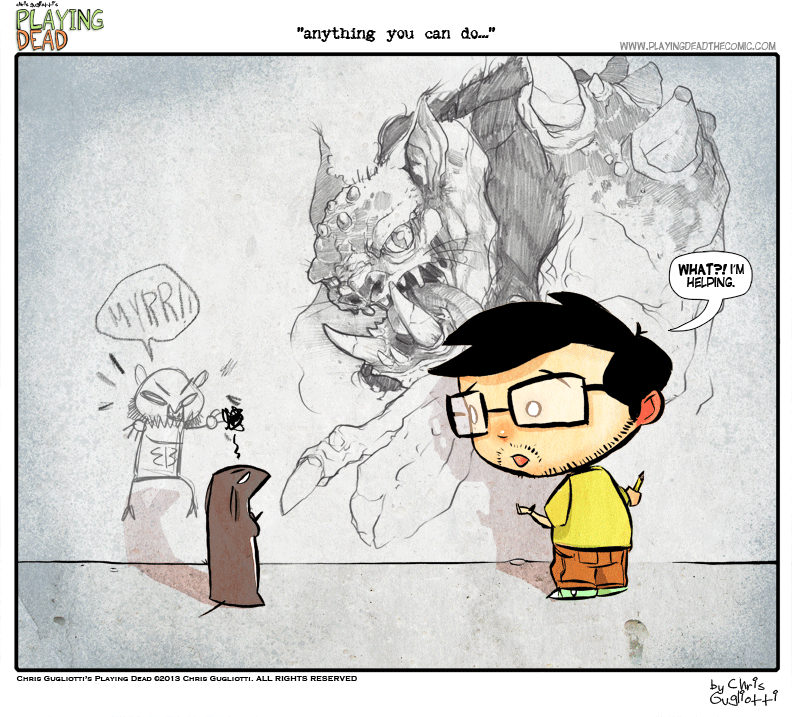 Anything you can do… by cgugliotti on May 30, 2013 at 7:51 am Chapter: comics In which we learn there’s no place for a one-upper. └ Tags: Animated, anxiety, autobiographical, chris gugliotti, comic, comic strip, dachshund, dacshund, dog, friendship, Gif, life, man's best friend, man-child, monster, nibbles, playing dead, web comic, webcomic