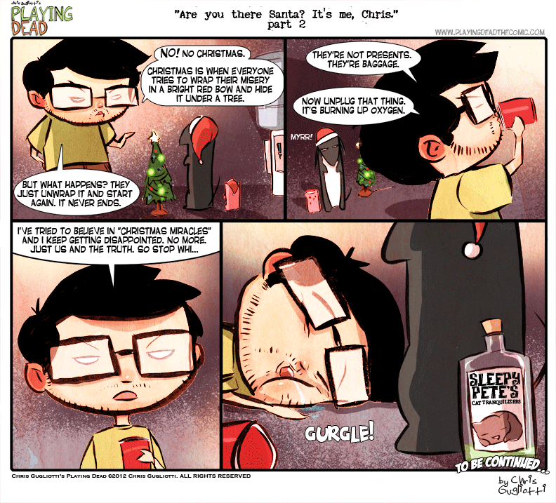 “Are you there Santa? It’s me, Chris.” part 2 by cgugliotti on December 12, 2012 at 8:17 am Chapter: comics Our Christmas adventure continues as I make my opinion known about the holidays and am met with a rebuttal. └ Tags: Animated, autobiographical, chris gugliotti, christmas, christmas adventure, christmas tree, comic, comic strip, dacshund, dog, friendship, Gif, introspection, life, man's best friend, man-child, nibbles, santa, santa claus, web comic, webcomic, xmas