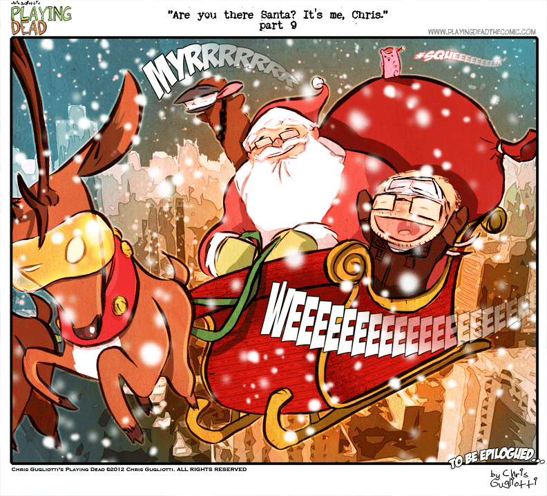 “Are you there Santa? It’s me, Chris.” part 9 by cgugliotti on December 21, 2012 at 6:23 am Chapter: comics The penultimate chapter of our Christmas adventure doesn’t need roads! └ Tags: Animated, chris gugliotti, christmas, christmas adventure, comic, comic strip, dacshund, dog, flying, friendship, Gif, holidays, life, man's best friend, nibbles, reindeer, santa, santa claus, santa's sleigh, snow, web comic, webcomic, xmas