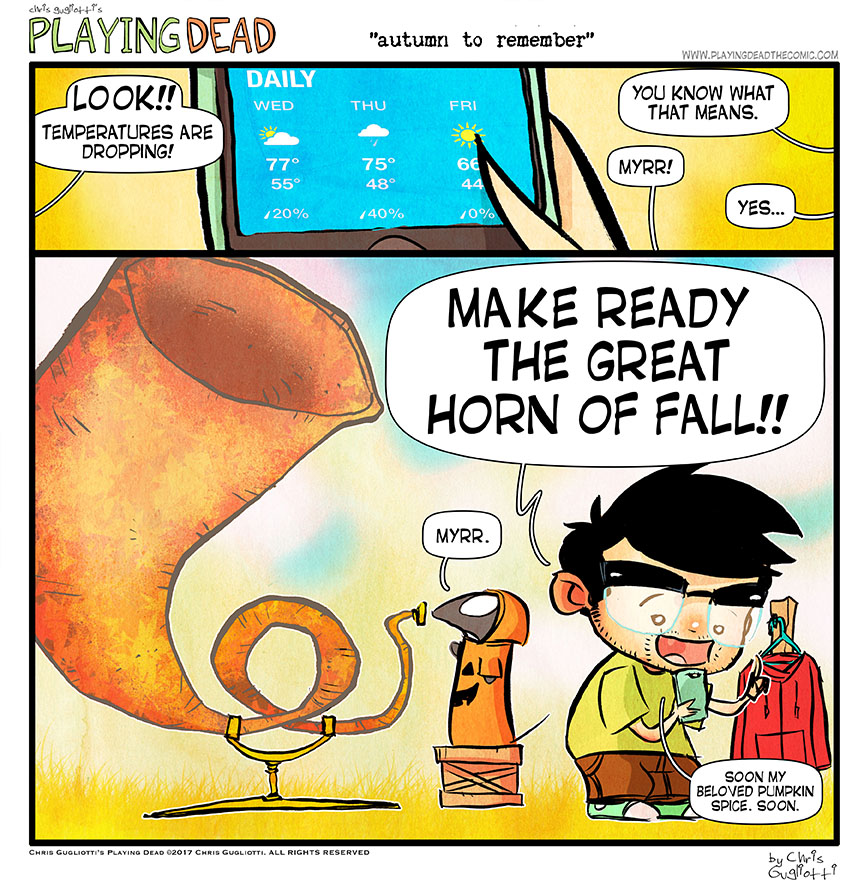 Autumn too Remember by cgugliotti on September 6, 2017 at 9:00 am Chapter: comicsCharacters: chris, nibbles In which we jump the gun for pumpkins sake. └ Tags: autobiographical, autumn, changing seasons, chris gugliotti, comic, comic strip, dachshund, dog, fall, friendship, halloween adventure, life, magic, man's best friend, man-child, nibbles, nibbles the dachshund, playing dead, seasons changing, web comic, Web comics, webcomic, webcomics, wtf