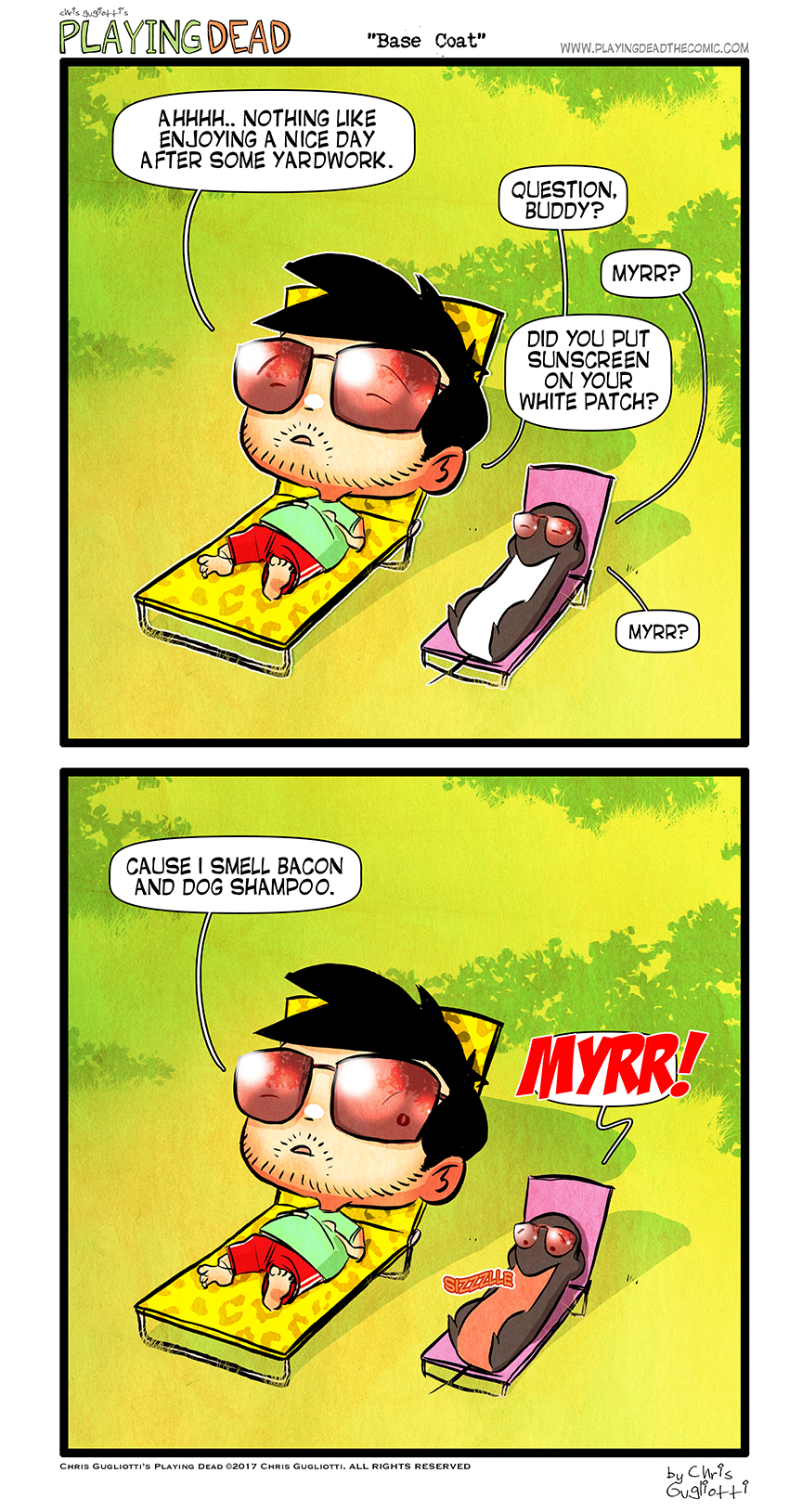 Base Coat by cgugliotti on May 25, 2017 at 9:00 am Chapter: comicsCharacters: chris, nibbles In which Nibs learns a lesson on SPF. └ Tags: anxiety, autobiographical, chris gugliotti, comic, comic strip, dachshund, dog, fantasy, friendship, introspection, life, man's best friend, man-child, nibbles, nibbles the dachshund, playing dead, relaxation, relaxing', summer, sun, sun burn, sun screen, sun tan, web comic, Web comics, webcomic, webcomics