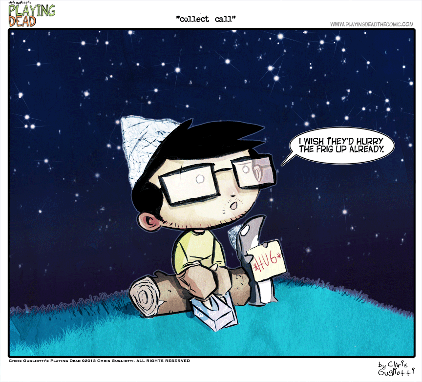 Collect Call by cgugliotti on March 7, 2013 at 10:35 am Chapter: comics In which we pine for the mothership. └ Tags: Animated, chris gugliotti, comic, comic strip, dacshund, dog, friendship, Gif, life, man's best friend, man-child, nibbles, playing dead, space, web comic, webcomic