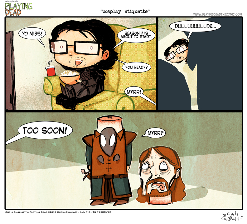 Cosplay Etiquette by cgugliotti on April 2, 2013 at 8:07 am Chapter: comics In which we learn that, in the world of Westeros, time may not heal all wounds. └ Tags: autobiographical, chris gugliotti, comic, comic strip, dacshund, dog, friendship, game of thrones, george rr martin, hbo, jon snow, man's best friend, man-child, ned stark, nibbles, playing dead, tv, video games, web comic, webcomic, Westeros