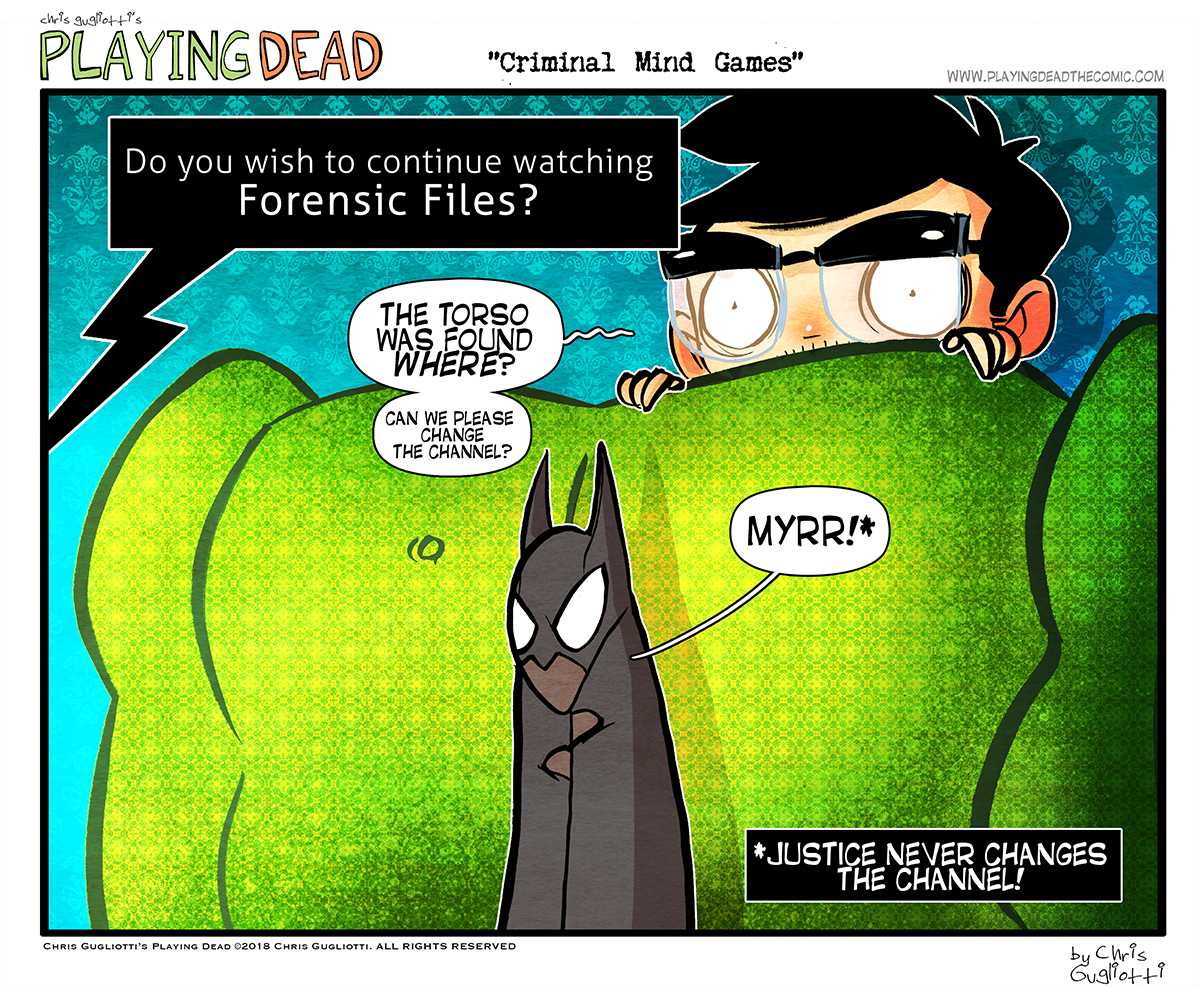 Criminal Mind Games by cgugliotti on February 21, 2018 at 9:00 am Chapter: comicsCharacters: chris, nibbles In which the search for justice brings a lack of sleep. └ Tags: anxiety, autobiographical, batman, chris gugliotti, comic, comic strip, crime, dachshund, dog, fantasy, friendship, horror, man's best friend, man-child, nibbles, nibbles the dachshund, playing dead, scary, television, true crime, tv, web comic, Web comics, webcomic, webcomics, wtf