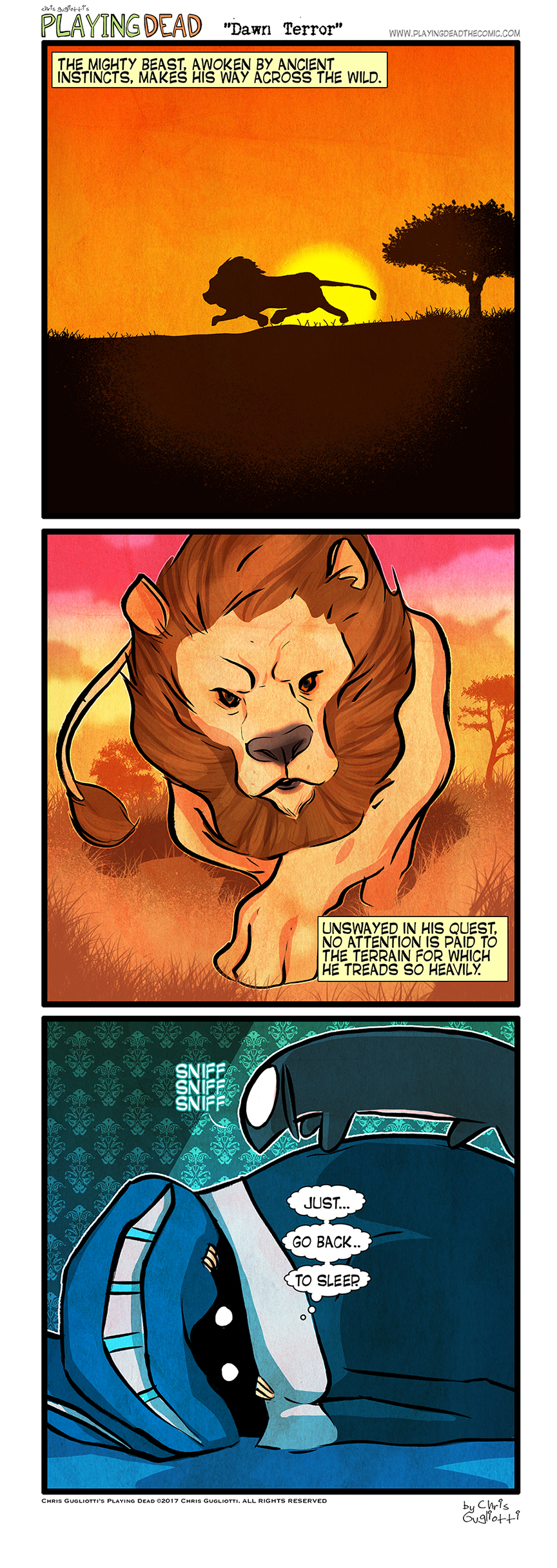 Dawn Terror by cgugliotti on April 27, 2017 at 9:00 am Chapter: comicsCharacters: chris, nibbles In which I face the Ghost and The Nibbles. └ Tags: anxiety, autobiographical, chris gugliotti, comic, comic strip, dachshund, dog, fantasy, friendship, ghost and the darkness, horror, hunted, hunter, life, lion, lions, man's best friend, nibbles, nibbles the dachshund, playing dead, web comic, Web comics, webcomic, webcomics