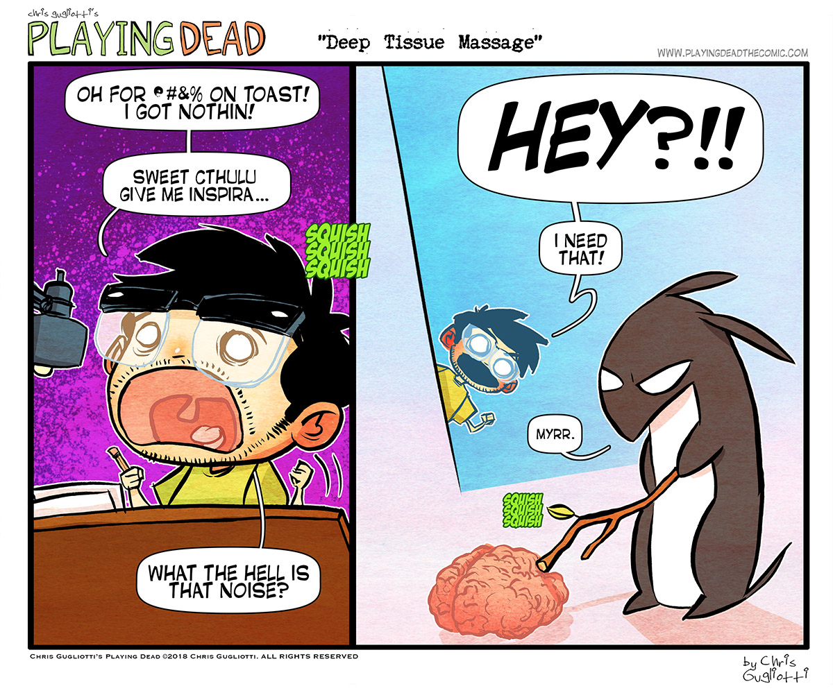 Deep Tissue massage by cgugliotti on May 16, 2018 at 9:00 am Chapter: comicsCharacters: chris, nibbles In which Nibs inspires. └ Tags: anxiety, autobiographical, chris gugliotti, comic, comic strip, dachshund, dog, friendship, horror, inspiration, introspection, life, man's best friend, nibbles, nibbles the dachshund, playing dead, web comic, Web comics, webcomic, webcomics, wtf
