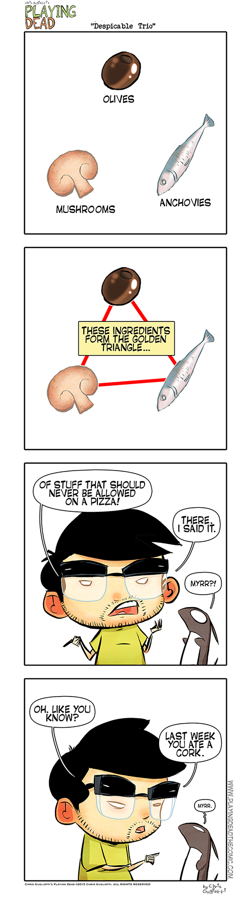 Despicable Trio by cgugliotti on August 30, 2016 at 9:00 am Chapter: comics In which taste shall never be questioned. └ Tags: anchovies, autobiographical, chris gugliotti, comic, comic strip, dachshund, diet, dog, food, friendship, introspection, life, man's best friend, man-child, mushrooms, nibbles, nibbles the dachshund, olives, pizza, pizza toppings, pizzas, playing dead, web comic, Web comics, webcomic, webcomics, wtf