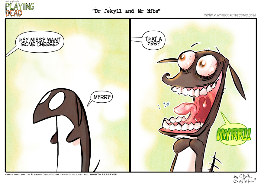 Dr. Jekyll and Mr. Nibs by cgugliotti on April 24, 2014 at 7:59 am Chapter: comics In which we learn we’re all just a thin cheese slice away from total anarchy. └ Tags: autobiographical, Cheese, chris gugliotti, comic, comic strip, dachshund, dog, dr. Jekyll and mr hyde, man's best friend, nibbles, transformation, web comic, Web comics, webcomic, webcomics