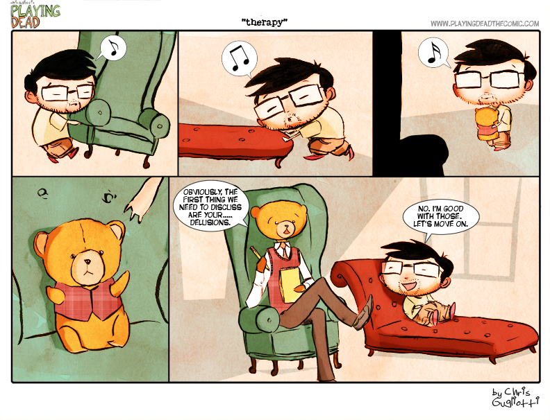 Dr. Ted phd by cgugliotti on July 20, 2012 at 11:46 am Chapter: comics Introducing Dr. Ted. Beloved childhood toy and psychotherapist. └ Tags: autobiographical, comic, comic strip, introspection, man-child, psychology, teddy bear, therapy, web comic, webcomic