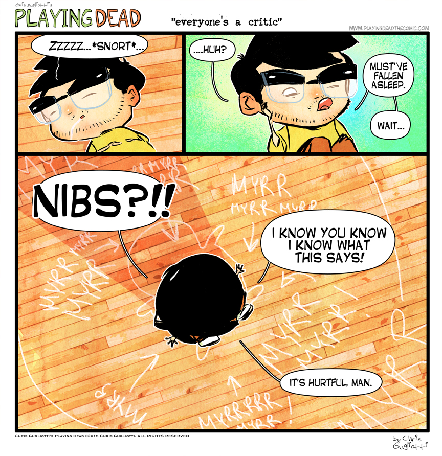 Everyone’s a Critic by cgugliotti on May 21, 2015 at 9:00 am Chapter: comics In which every dog has an opinion. └ Tags: autobiographical, chris gugliotti, comic, comic strip, dachshund, dog, friendship, life, man's best friend, myrr, nibbles, playing dead, web comic, Web comics, webcomic, webcomics, wtf