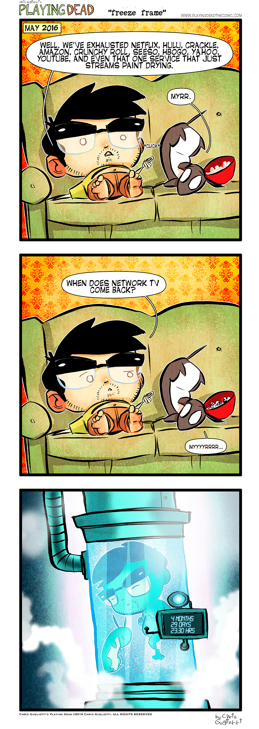 Freeze Frame by cgugliotti on September 27, 2016 at 9:00 am Chapter: comicsCharacters: chris, nibbles In which we must be entertained! └ Tags: anxiety, autobiographical, chris gugliotti, comic, comic strip, couch potato, cryogenics, dachshund, dog, friendship, frozen, introspection, lazy, life, man's best friend, man-child, new tv season, nibbles, nibbles the dachshund, obsession, playing dead, television, time travel, tv, Web comics, webcomic, webcomics, wtf