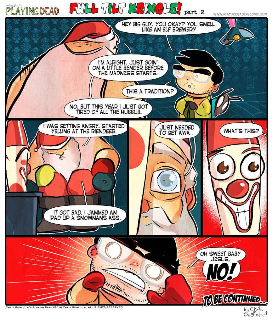 FULL TILT KRINGLE part 2 by cgugliotti on December 4, 2014 at 8:29 am Chapter: comics Our Christmas story continues with Santa woes as well as something clownish looming over the horizon! └ Tags: a christmas story, autobiographical, chris gugliotti, christmas, christmas adventure, clown, clowns, comic, comic strip, creepy clown, dachshund, dog, fantasy, friendship, full tilt kringle, magic, man's best friend, man-child, nibbles, playing dead, santa, santa claus, science fiction, web comic, Web comics, webcomic, webcomics, xmas