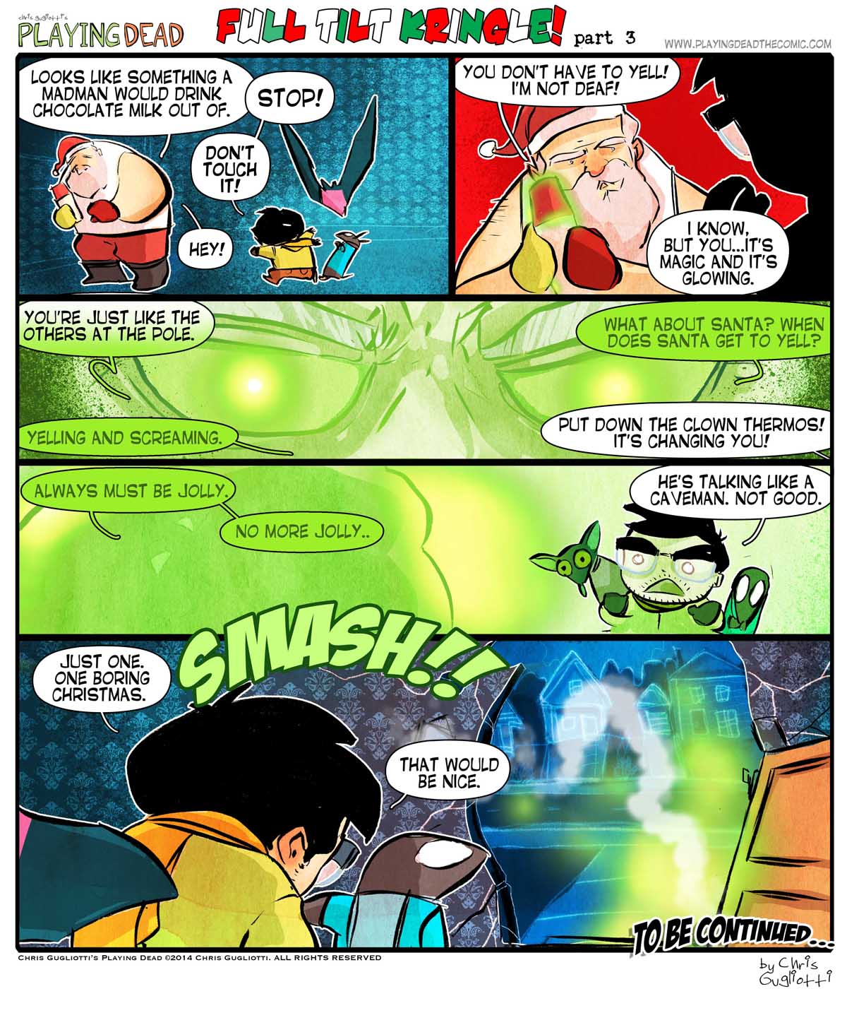 FULL TILT KRINGLE part 3 by cgugliotti on December 9, 2014 at 8:54 am Chapter: comics Clown+Magic+Santa = Trouble └ Tags: anxiety, chris gugliotti, christmas, christmas adventure, clown, clown thermos, comic, comic strip, dachshund, dog, fantasy, full tilt kringle, life, magic, man's best friend, nibbles, playing dead, santa, santa claus, web comic, Web comics, webcomic, webcomics, xmas