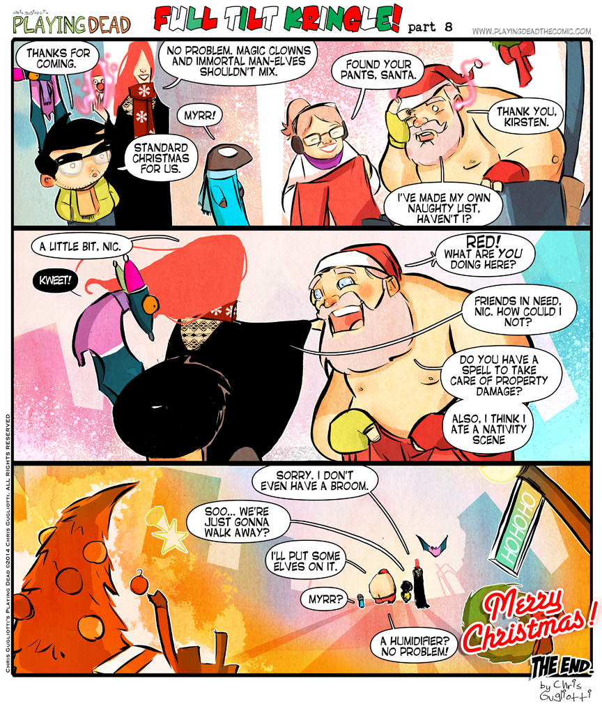 FULL TILT KRINGLE part 8 by cgugliotti on December 25, 2014 at 8:52 am Chapter: comics And with that we wish you all a very MERRY CHRISTMAS! └ Tags: chris gugliotti, christmas, christmas adventure, comic, comic strip, dachshund, dog, friendship, full tilt kringle, halloween adventure, happy holidays, holidays, life, magic, man's best friend, merry christmas, nibbles, playing dead, santa, santa claus, snow, web comic, Web comics, webcomic, webcomics, xmas