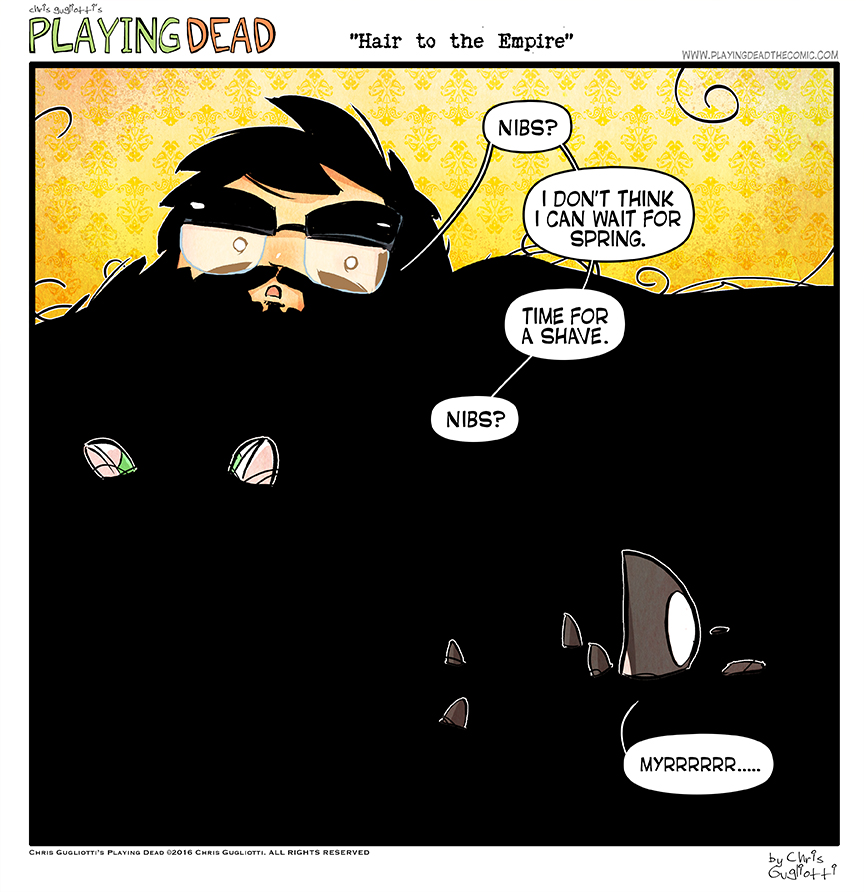 Hair to the Empire by cgugliotti on February 9, 2016 at 9:00 am Chapter: comics In which Nibbles floats on a sea of tangled man fur. └ Tags: autobiographical, beard, chris gugliotti, comic, comic strip, dachshund, dog, friendship, hair, man's best friend, nibbles, nibbles the dachshund, playing dead, web comic, Web comics, webcomic, webcomics, wtf