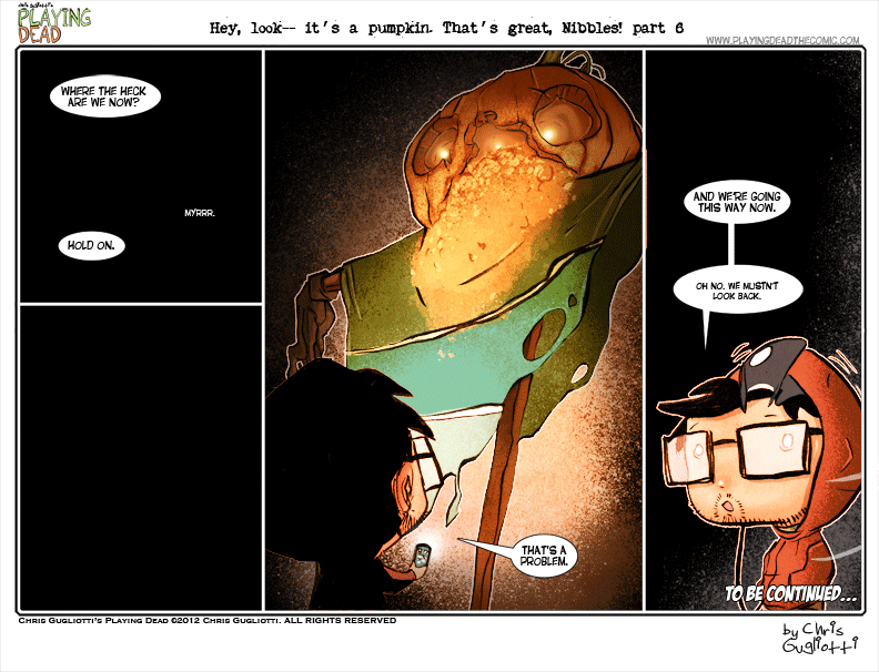 Hey, look– it’s a pumpkin. That’s great, Nibbles! part 6 by cgugliotti on October 25, 2012 at 9:44 am Chapter: comics In which we learn it’s best to just not turn on the lights. └ Tags: Animated, autobiographical, chris gugliotti, comic, comic strip, dacshund, daschund, dog, friendship, Gif, HALLOWEEN, horror, life, man's best friend, nibbles, scarecrow, scary, web comic, webcomic