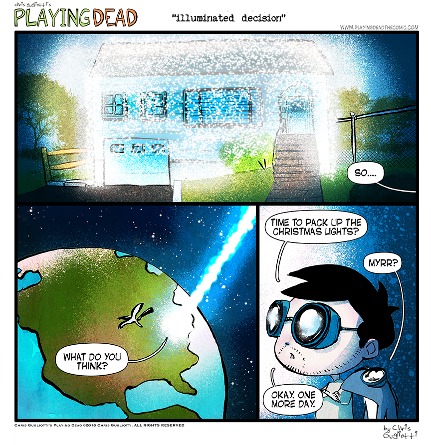 Illuminated Decision by cgugliotti on January 12, 2016 at 9:00 am Chapter: comics In which we must come to grips with the passing of the holiday season. └ Tags: autobiographical, chris gugliotti, christmas, christmas decorations, christmas lights, comic, comic strip, dachshund, dog, friendship, holidays, introspection, life, man's best friend, nibbles, nibbles the dachshund, playing dead, web comic, Web comics, webcomic, webcomics, xmas