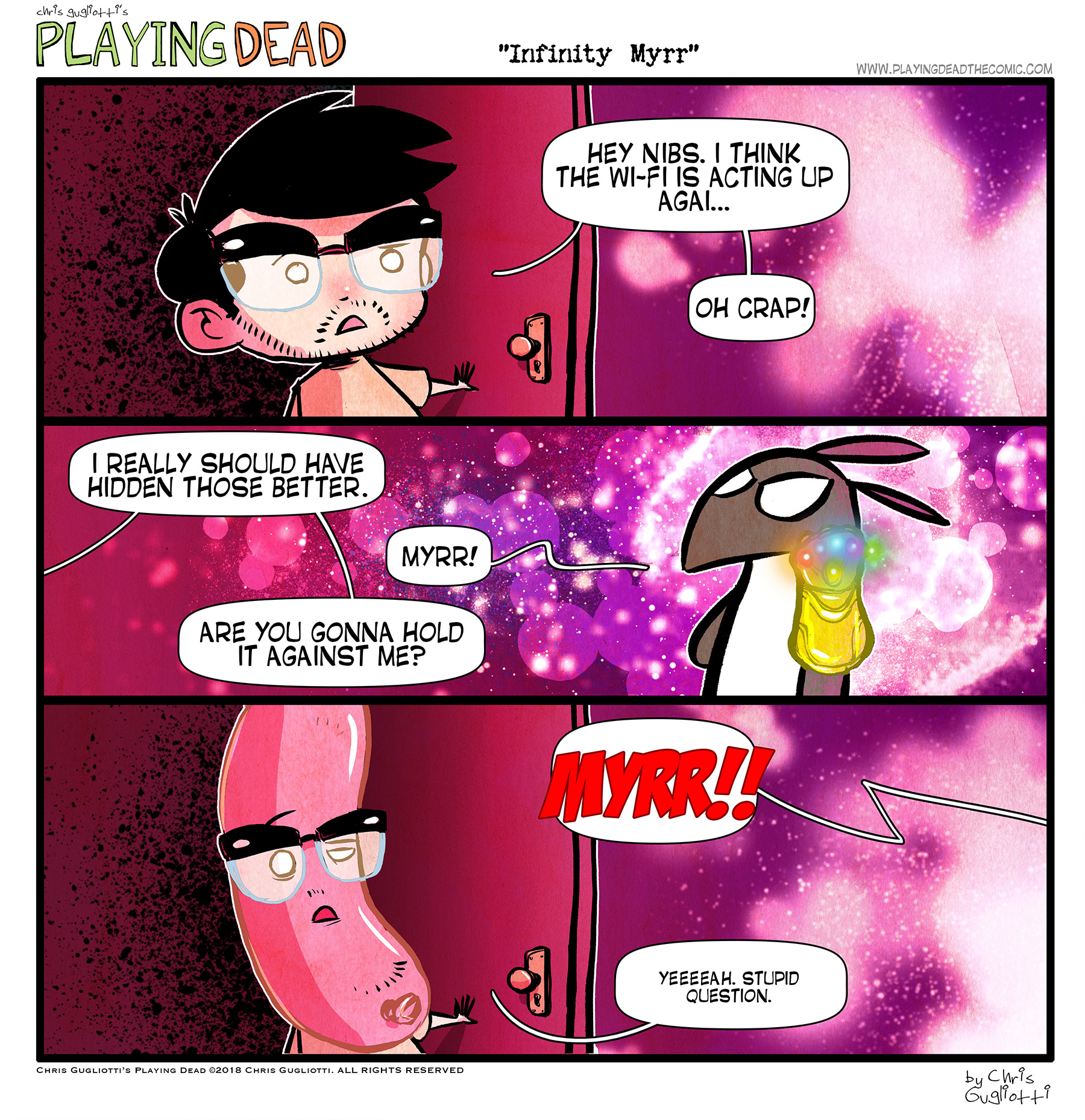 Infinity Myrr by cgugliotti on May 2, 2018 at 9:00 am Chapter: comicsCharacters: chris, nibbles In which Nibs brings order and reason to the universe. └ Tags: anxiety, autobiographical, avengers, avengers infinity war, chris gugliotti, comic, comic strip, cosmic, dachshund, dog, friendship, infinity gauntlet, infinity war, infintywar, man's best friend, marvel, marvel vomics, mind gem, nibbles, nibbles the dachshund, playing dead, power, power gem, reality gem, science fiction, soul gem, space, space gem, thanos, time gem, web comic, Web comics, webcomic, webcomics, wtf