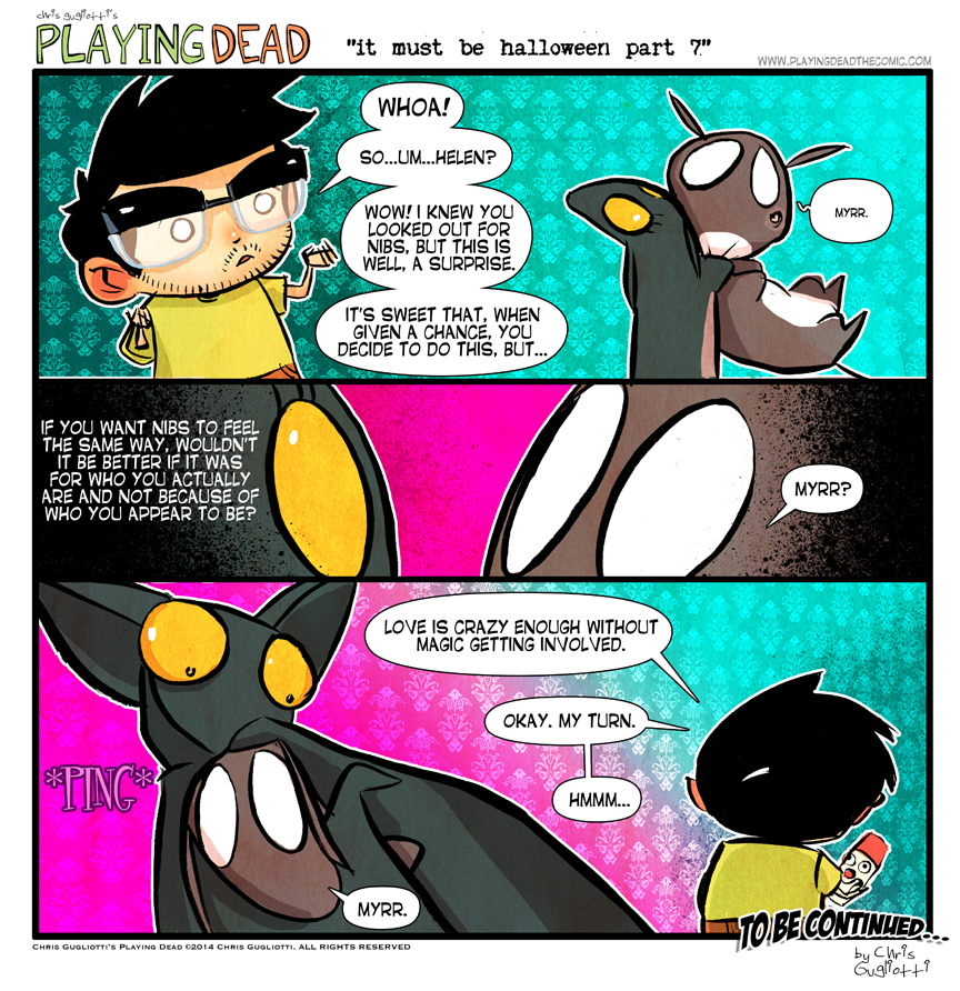 It Must Be Halloween part 7 by cgugliotti on October 23, 2014 at 9:31 am Chapter: comics In which Helen learns a lesson. └ Tags: autobiographical, chris gugliotti, comic, comic strip, dachshund, dog, fantasy, friendship, HALLOWEEN, halloween adventure, introspection, life, love, magic, man's best friend, man-child, nibbles, playing dead, web comic, Web comics, webcomics