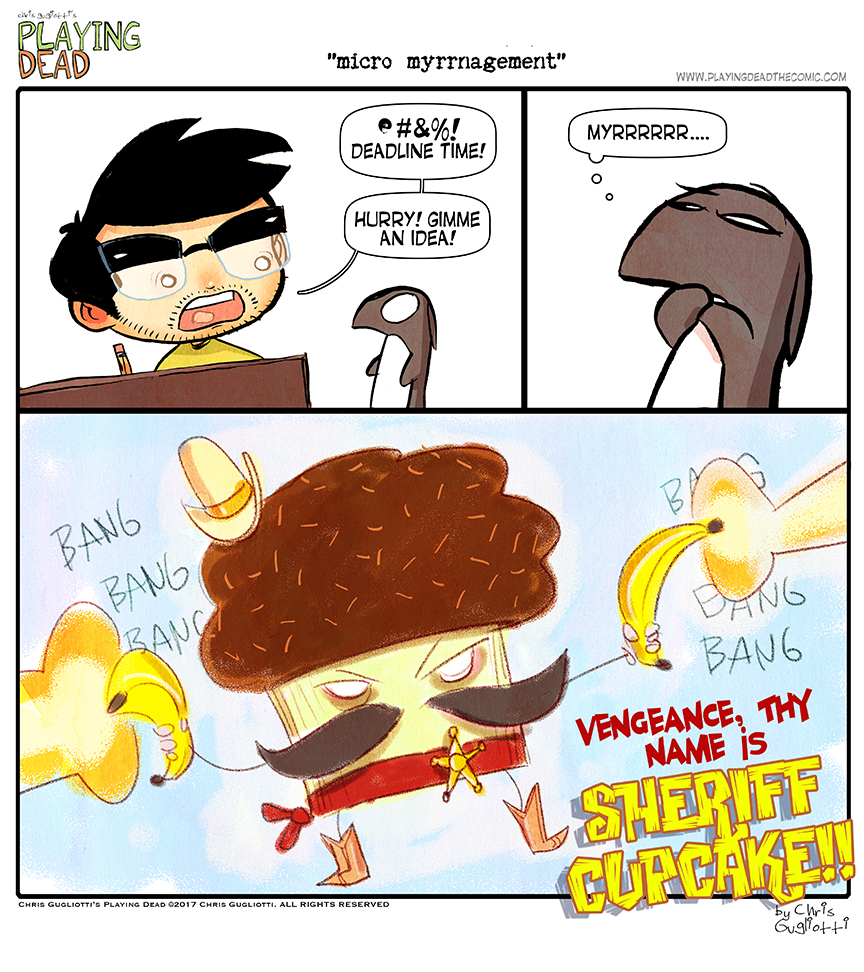 Micro Myrrnagement by cgugliotti on June 1, 2017 at 9:00 am Chapter: comicsCharacters: chris, nibbles In which Nibbles knocks it out of the park. └ Tags: autobiographical, chris gugliotti, comic, comic strip, cupcakes, dachshund, deadlines, dog, fantasy, friendship, life, man's best friend, man-child, nibbles, nibbles the dachshund, playing dead, web comic, Web comics, webcomic, webcomics, wtf