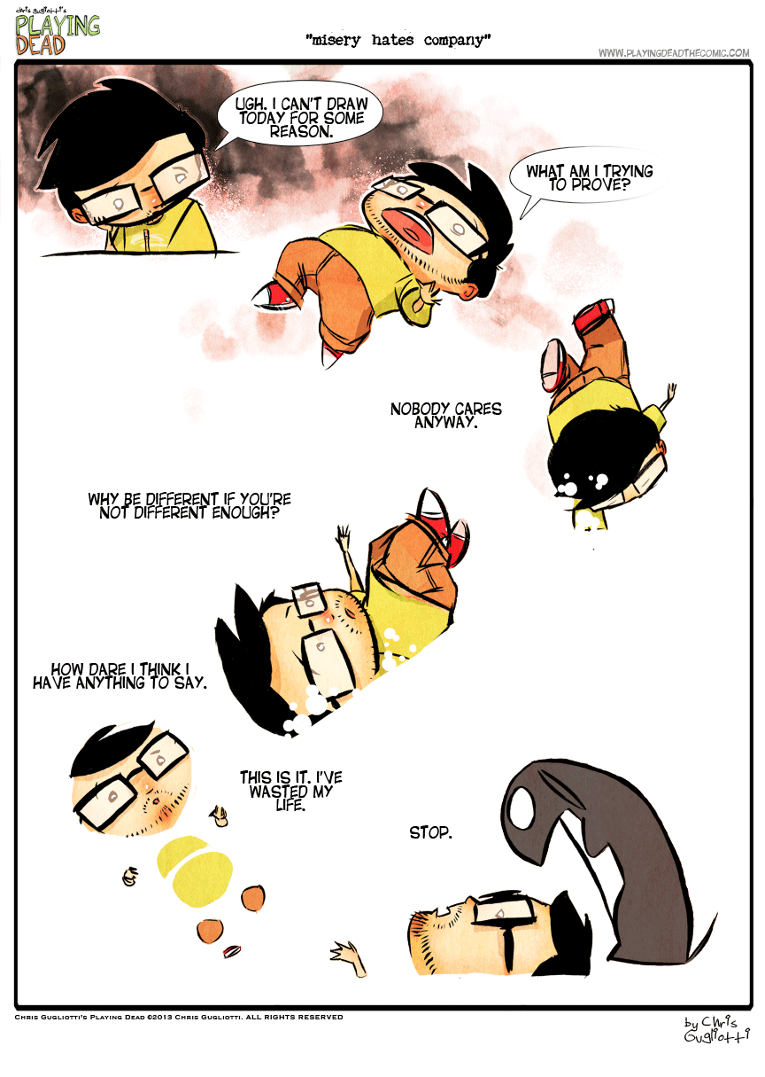 Misery hates Company by cgugliotti on November 19, 2013 at 6:45 am Chapter: comics In which the creative process can be kind of a bastard sometimes. └ Tags: Animated, anxiety, autobiographical, chris gugliotti, comic, comic strip, creative process, dachshund, dog, doubt, friendship, Gif, introspection, life, man's best friend, playing dead, self doubt, web comic, Web comics, webcomic, webcomics
