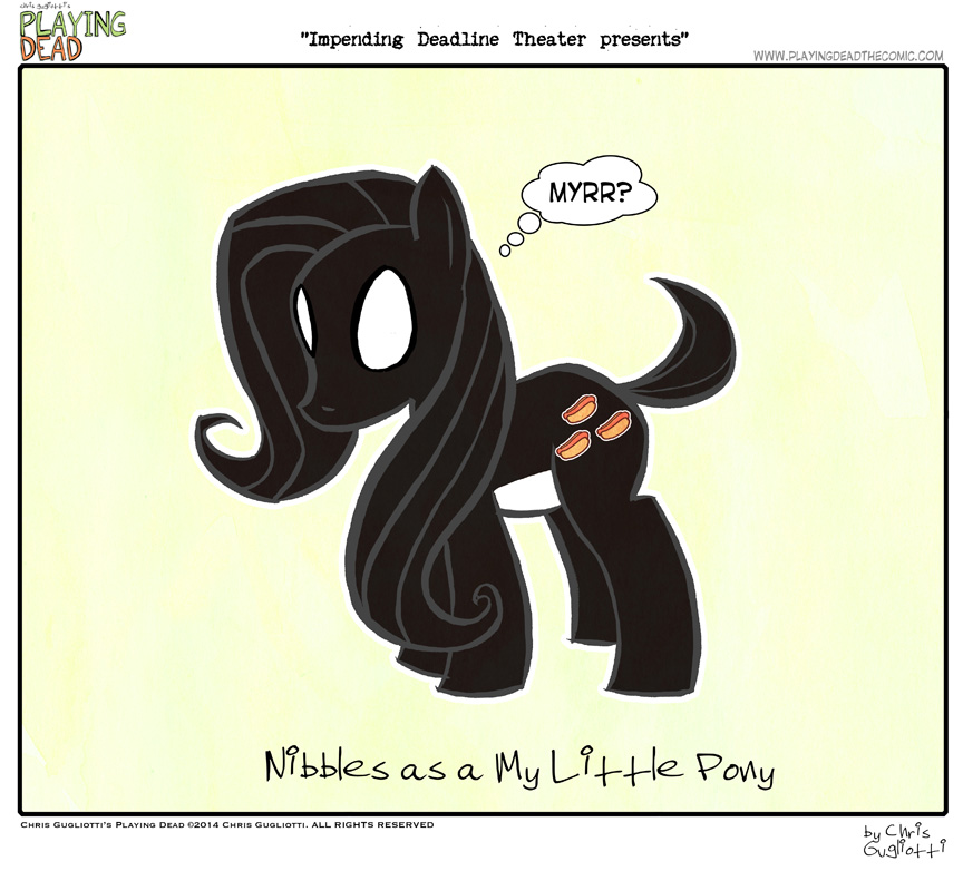 My Little Nibbles by cgugliotti on January 30, 2014 at 7:36 am Chapter: comics In which Impending Deadline Theater presents the Nibbles of an alternate dimension. One where friendship is MAGIC!!! └ Tags: bronie, chris gugliotti, comic, comic strip, dachshund, dog, friendship, friendship is magic, man's best friend, my little pony, my little pony friendship is magic, nibbles, playing dead, pony, web comic, Web comics, webcomic