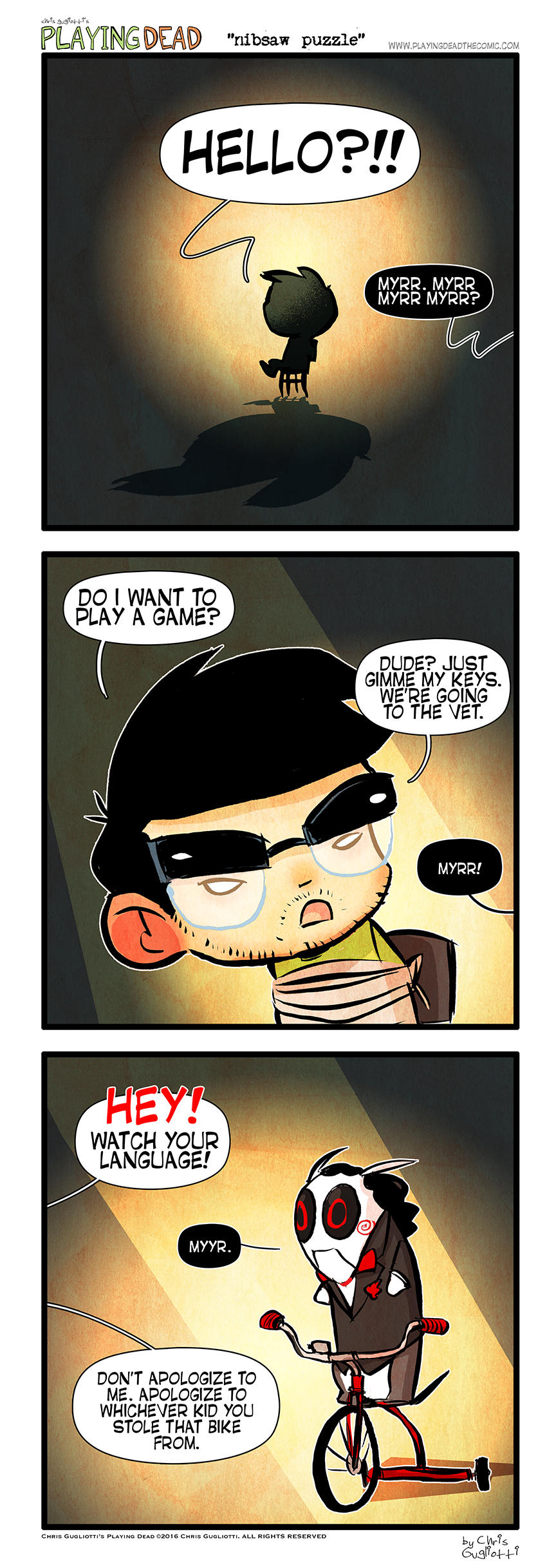 Nibsaw Puzzle by cgugliotti on October 11, 2016 at 9:00 am Chapter: comicsCharacters: chris, nibbles In which I refuse to play games. └ Tags: anxiety, chris gugliotti, comic, comic strip, cosplay, dachshund, dog, friendship, HALLOWEEN, halloween adventure, holidays, horror, horror movie, horror movie parody, jigsaw, man's best friend, nibbles, nibbles the dachshund, playing dead, saw 3, saw 4, saw 5, saw saw 2, web comic, Web comics, webcomic, webcomics, wtf