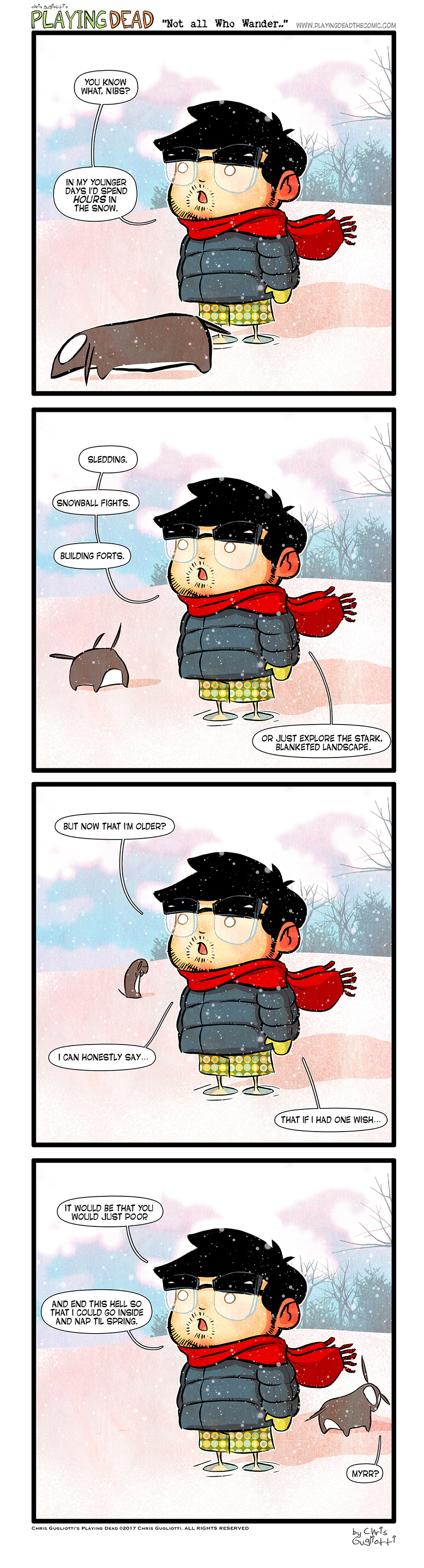Not All Who Wander by cgugliotti on February 7, 2017 at 9:00 am Chapter: comicsCharacters: chris, nibbles In which anticipation is killing me └ Tags: anxiety, autobiographical, chris gugliotti, comic, comic strip, dachshund, dog, dog poop, friendship, life, man's best friend, man-child, nibbles, nibbles the dachshund, playing dead, snow, web comic, Web comics, webcomic, webcomics, wtf