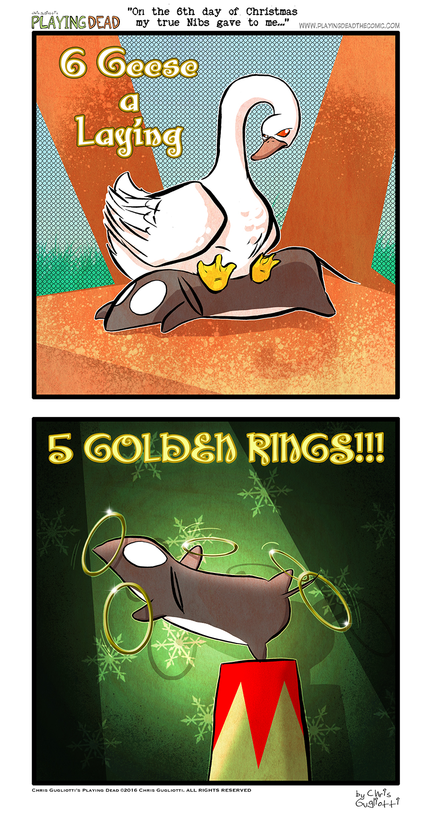 On the 6th Nibs of Christmas….. by cgugliotti on December 13, 2016 at 9:00 am Chapter: comicsCharacters: nibbles In which more birds and shiny things abound!! └ Tags: 12 days of christmas, 12 nibs of christmas, 5 golden rings, 6 geese a laying, autobiographical, chris gugliotti, christmas, christmas adventure, comic, comic strip, cosplay, dachshund, dog, holidays, life, magic, man's best friend, nibbles, nibbles the dachshund, playing dead, web comic, Web comics, webcomic, webcomics, winter, xmas