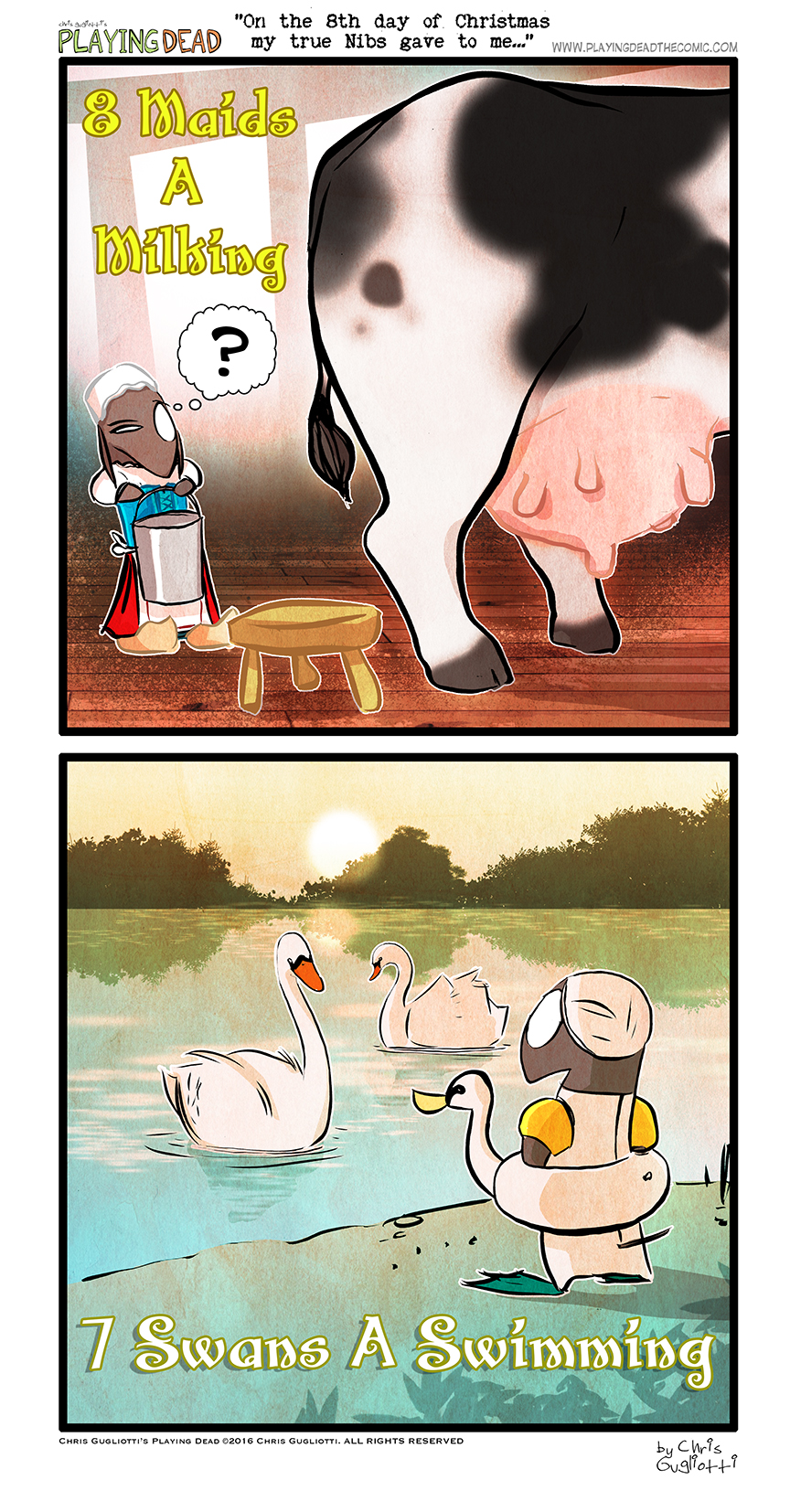 On the 8th Nibs of Christmas…. by cgugliotti on December 8, 2016 at 9:00 am Chapter: comicsCharacters: nibbles In which the Nibs keeps on Christmasing on! └ Tags: 12 days of christmas, 12 nibs of christmas, autobiographical, chris gugliotti, christmas, christmas adventure, comic, comic strip, cosplay, dachshund, dog, fantasy, holidays, magic, mais a milking, man's best friend, nibbles, nibbles the dachshund, playing dead, swan, web comic, Web comics, webcomic, webcomics, xmas