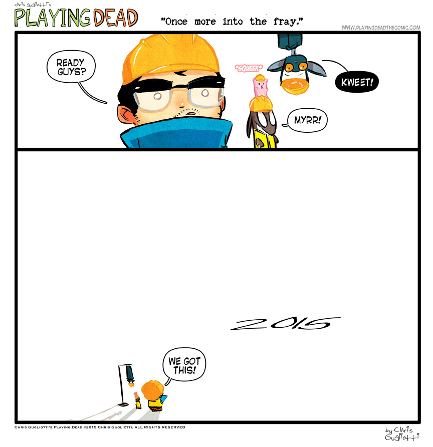 Once more into the Fray by cgugliotti on January 1, 2015 at 9:00 am Chapter: comics New year, new beginnings. └ Tags: 2015, autobiographical, chris gugliotti, dachshund, dog, friendship, happy new year, introspection, life, man's best friend, man-child, mister bear, mr bear, New beginning, new year, new years, new years day, nibbles, playing dead, web comic, Web comics, webcomic, webcomics