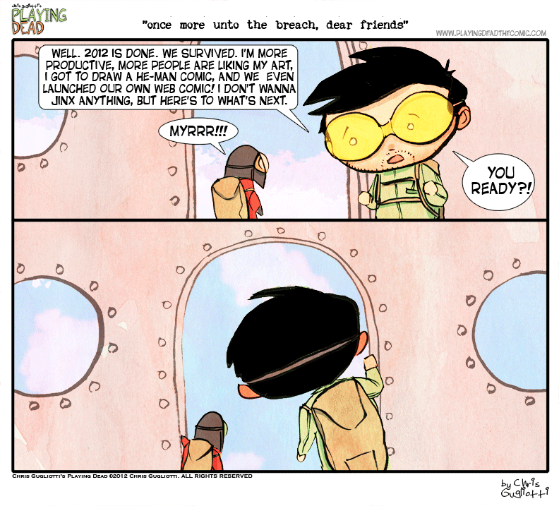 Once more unto the breach, dear friends by cgugliotti on January 2, 2013 at 9:05 am Chapter: comics In which, fingers crossed and buttholes clenched, we leap into the new year. └ Tags: Animated, anxiety, autobiographical, chris gugliotti, comic strip, dacshund, dog, friendship, Gif, introspection, life, man's best friend, man-child, new year, nibbles, playing dead, web comic, webcomic