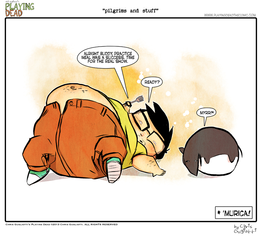 Pilgrims and stuff by cgugliotti on November 28, 2013 at 8:40 am Chapter: comics In which we give thanks for elastic waistbands. └ Tags: autobiographical, chris gugliotti, comic, comic strip, dachshund, dog, food, friendship, glutony, life, man's best friend, nibbles, playing dead, thanksgiving, web comic, Web comics, webcomic, webcomics