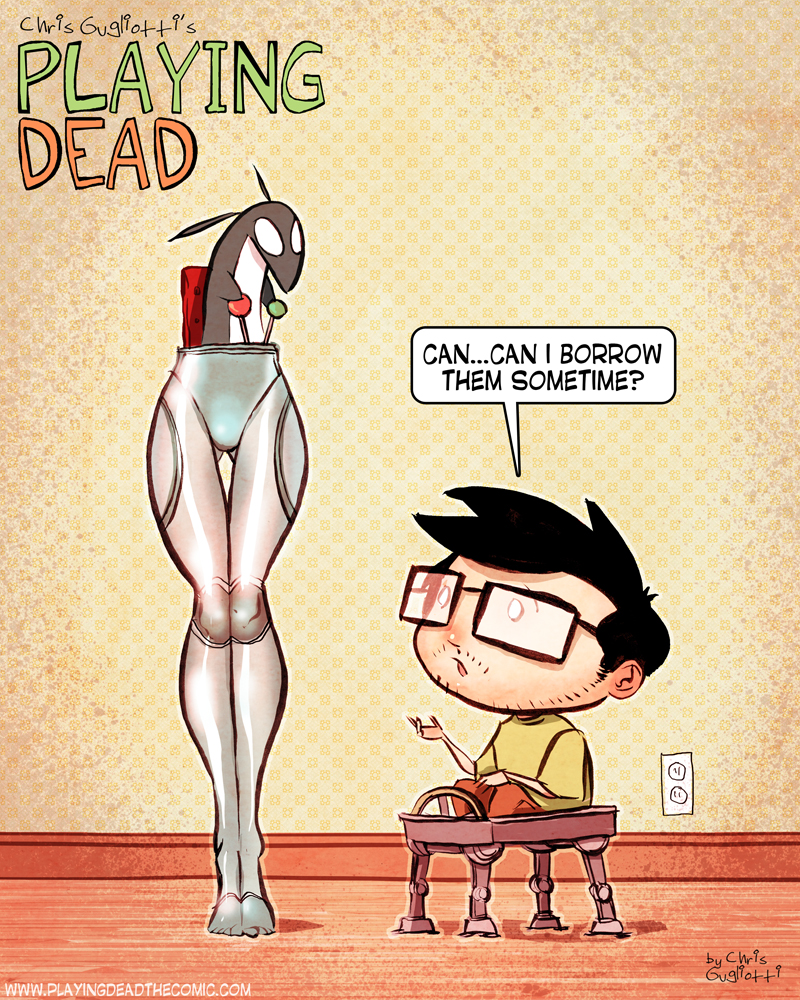 Pin-Up Friday: And he knows how to use them. by cgugliotti on February 22, 2013 at 2:36 pm Chapter: Blog └ Tags: chris gugliotti, dacshund, dog, friendship, man's best friend, man-child, nibbles, pin up, playing dead, web comic, webcomic