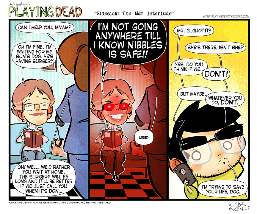 Sidesick: The mom Interlude by cgugliotti on March 29, 2016 at 9:00 am Chapter: comics In which you never tell my mother what to do. HELP NIBBLES FUND └ Tags: anxiety, autobiographical, chris gugliotti, comic, comic strip, dachshund, dog, dog care, friendship, Grandmother, grandmothers, health, healthcare, introspection, life, man's best friend, mother, mothers, mothers love, nibbles, nibbles the dachshund, pet, pet care, playing dead, sick dog, web comic, Web comics, webcomic, webcomics
