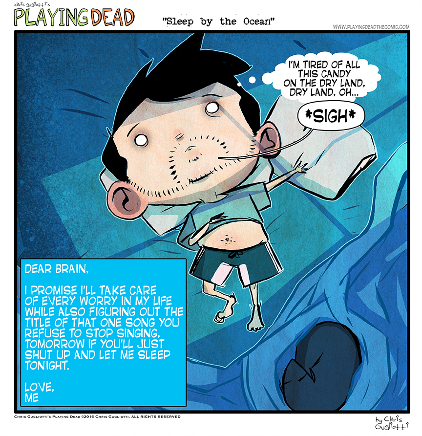 Sleep by the Ocean by cgugliotti on June 16, 2016 at 9:00 am Chapter: comics In which there is no “off” switch. └ Tags: anxiety, autobiographical, bed, bed time, chris gugliotti, comic, comic strip, dachshund, dog, friendship, insomnia, introspection, life, man's best friend, man-child, nibbles, nibbles the dachshund, playing dead, sleep, web comic, Web comics, webcomic, webcomics