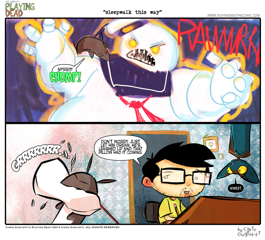 Sleepwalk this way by cgugliotti on March 4, 2014 at 8:11 am Chapter: comics In which “Little Nibs in Dreamland” gets epic!! └ Tags: 80s movies, autobiographical, chris gugliotti, comic, comic strip, dachshund, dog, dream, dreaming, dreams, friendship, ghostbusters, man's best friend, nibbles, playing dead, science fiction, stay puft marshmallow man, web comic, Web comics, webcomic, webcomics