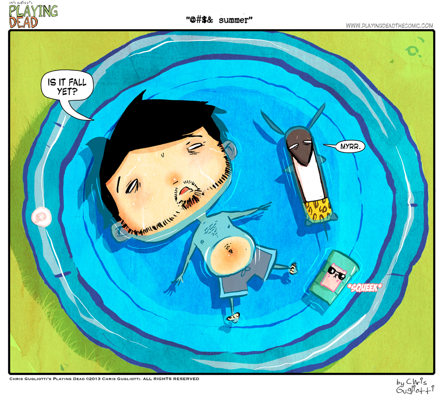 @#$& Summer by cgugliotti on August 15, 2013 at 8:40 am Chapter: comics In which we define our relationship with the seasons. └ Tags: autobiographical, chris gugliotti, comic, comic strip, dachshund, dog, friendship, heat, life, man's best friend, man-child, nibbles, playing dead, pool, summer, summertime, sweating, swimming, web comic, Web comics, webcomic, webcomics