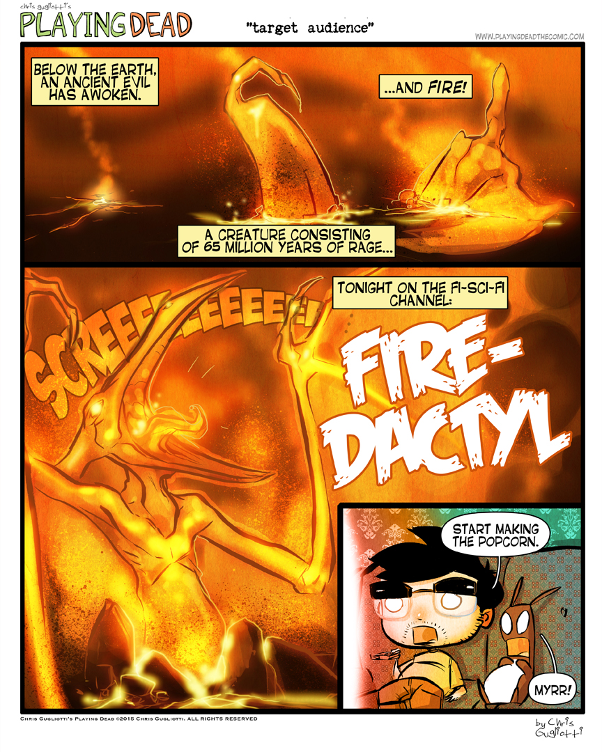Target Audience by cgugliotti on July 2, 2015 at 9:01 am Chapter: comics In which we can’t help ourselves. └ Tags: absurd, autobiographical, cheesy movies, chris gugliotti, comic, comic strip, dachshund, dinosaurs, dog, fantasy, fire-dactyl, friendship, man's best friend, man-child, movies, nibbles, playing dead, sci fi, science fiction, web comic, Web comics, webcomic, webcomics