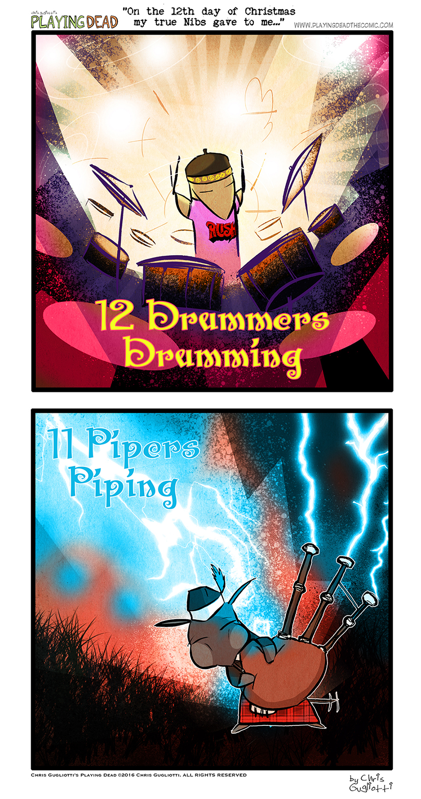 The 12 Nibs of Christmas by cgugliotti on December 1, 2016 at 9:00 am Chapter: comicsCharacters: nibbles In which we begin the 12 Nibs of Christmas └ Tags: 11 pipers piping, 12 days of christmas, 12 drummers drumming, 12 nibs of christmas, bagpipes, chris gugliotti, christmas, christmas adventure, comic, comic strip, cosplay, dachshund, dog, fantasy, holidays, life, man's best friend, neil peart, nibbles, nibbles the dachshund, playing dead, rush, scottish, web comic, Web comics, webcomic, webcomics, xmas