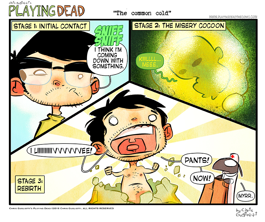 The Common Cold by cgugliotti on February 25, 2016 at 9:00 am Chapter: comics In which wellness is a waiting game. └ Tags: anxiety, autobiographical, chris gugliotti, cold, comic, dog, friendship, health, healthcare, illness, medical care, nibbles, nibbles the dachshund, playing dead, web comic, Web comics, webcomic, webcomics, wellness, wtf