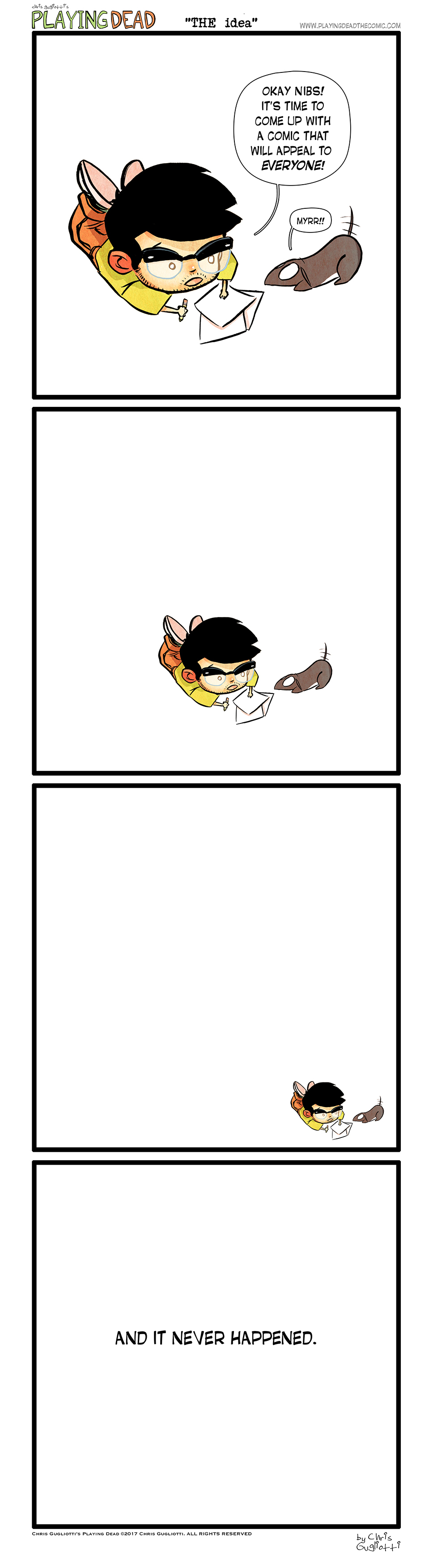 The Idea by cgugliotti on January 31, 2017 at 9:00 am Chapter: comicsCharacters: chris, nibbles In which we make everybody happy! └ Tags: anxiety, art, autobiographical, chris gugliotti, comic, comic strip, dachshund, dog, friendship, introspection, life, making art, man's best friend, nibbles, nibbles the dachshund, playing dead, web comic, Web comics, webcomic, webcomics, wtf
