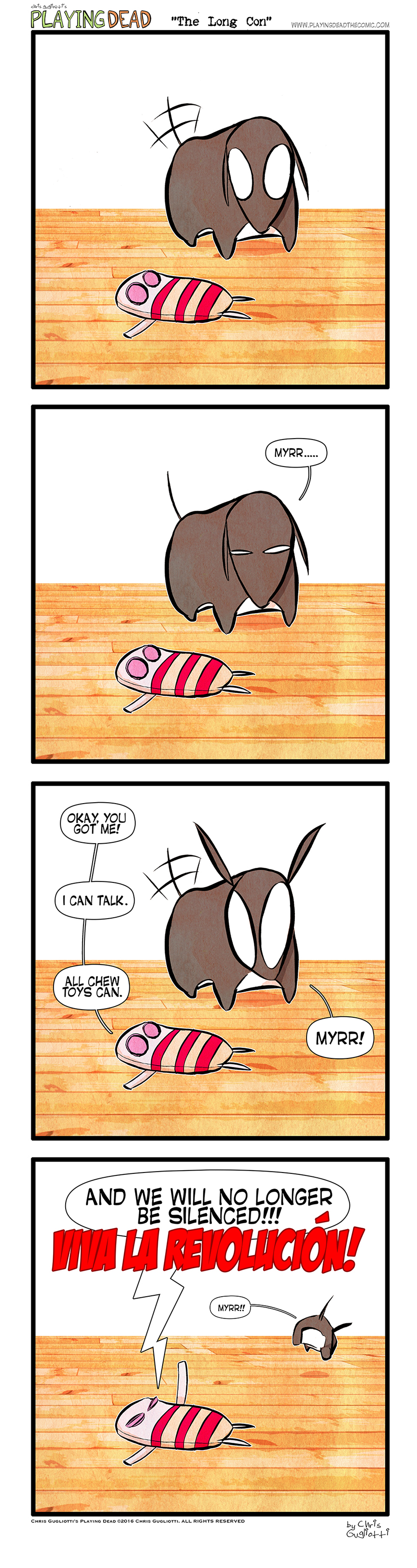 The Long Con by cgugliotti on January 19, 2017 at 9:00 am Chapter: comicsCharacters: nibbles In which the cold dish of revenge will be served! └ Tags: anxiety, autobiographical, chew toy, chew toys, chris gugliotti, comic, comic strip, dachshund, dog, dog toy, Dog toys, fantasy, friendship, life, man's best friend, nibbles, nibbles the dachshund, playing dead, revenge, revolution, vengeance, web comic, webcomic, wtf