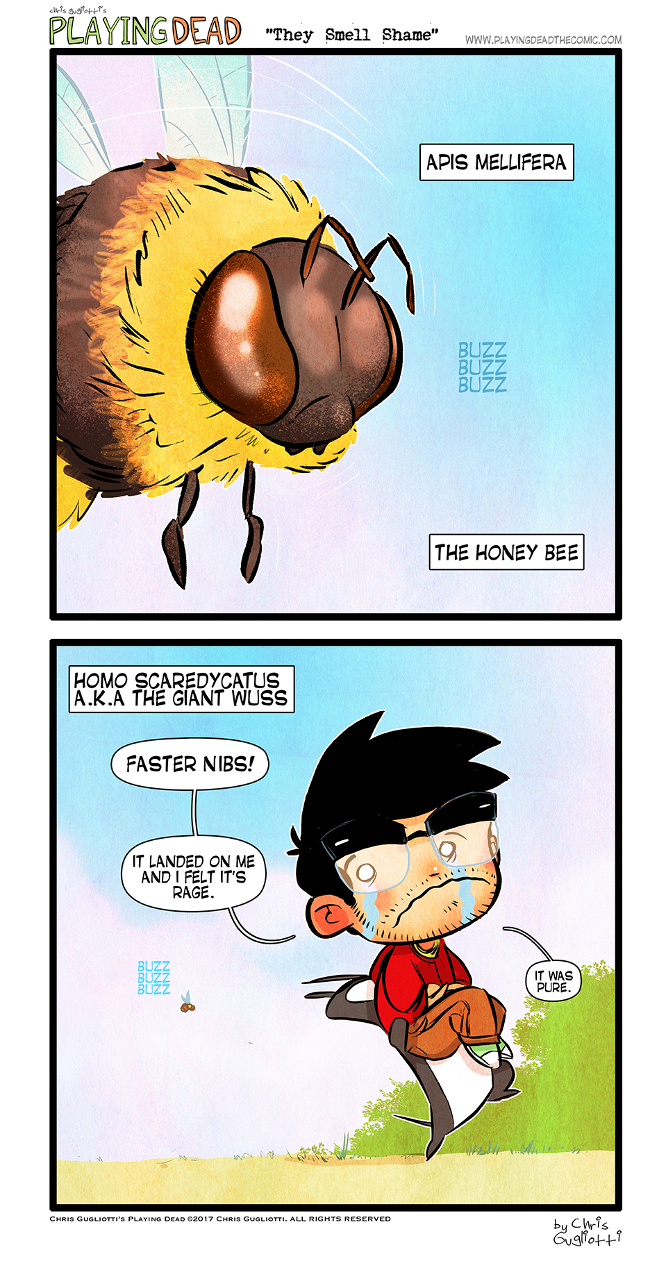 They Smell Shame by cgugliotti on March 30, 2017 at 9:00 am In which I’m not proud of myself. └ Tags: anxiety, autobiographical, bee, bees, bug, bugs, chris gugliotti, comic, comic strip, dachshund, dog, fear of insects, friendship, life, man's best friend, Marvel comics, Nature, nature is scary, nibbles the dachshund, outside, playing dead, spring, web comic, Web comics, webcomic, wtf