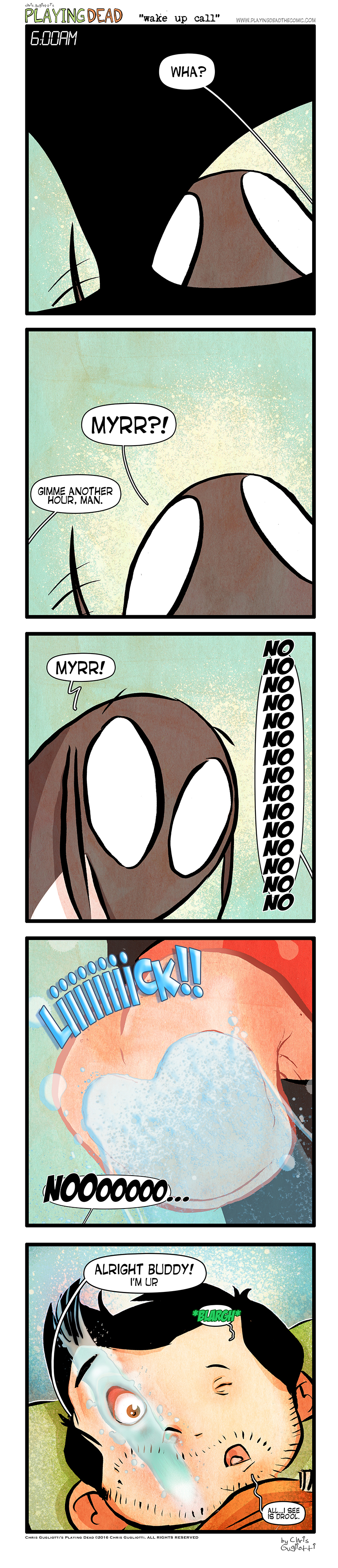 Wake Up Call by cgugliotti on November 10, 2016 at 9:00 am Chapter: comicsCharacters: chris, nibbles In which Nibs makes a damp alarm clock. └ Tags: anxiety, autobiographical, chris gugliotti, comic strip, dachshund, dog, dog breathe, friendship, horror, licking, life, man's best friend, nibbles, nibbles the dachshund, playing dead, sleep, web comic, Web comics, webcomic, webcomics, wtf