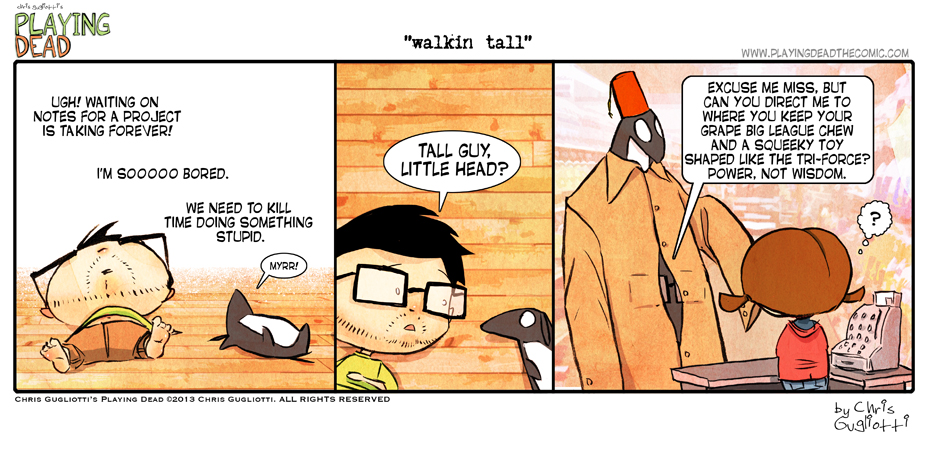 Walking Tall by cgugliotti on February 11, 2013 at 8:27 am Chapter: comics In which we find ways to distract the monster of boredom. └ Tags: autobiographical, chris gugliotti, comic, comic strip, dacshund, dog, friendship, life, man's best friend, man-child, nibbles, playing dead, web comic, webcomic