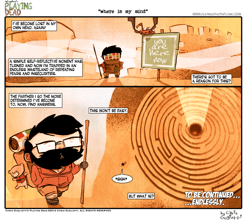 Where is my mind? by cgugliotti on November 26, 2012 at 8:29 am Chapter: comics In which I get lost in familiar places. └ Tags: Animated, anxiety, autobiographical, brain, chris gugliotti, comic, comic strip, introspection, life, lost, mental issues, psychological, the mind, therapy, web comic, webcomic